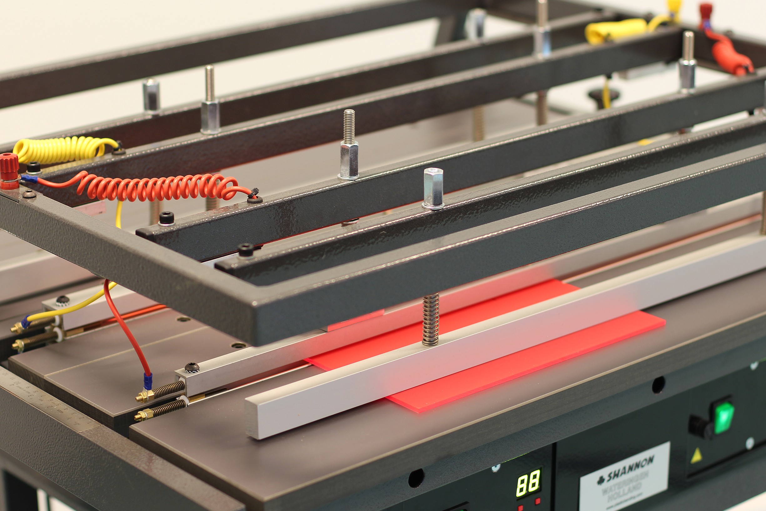 El marc superior pneumàtic té barres de pressió ajustables que mantenen les plaques al seu lloc i eviten que es deformin (efecte banana). El marc superior és controlat per un pedal, un interruptor temporitzador i una parada d'emergència. La superfície de treball amb tractament durador i resistent a la calor consta de diversos panells ajustables i té un topall paral·lel amb indicació en mil·límetres i polzades.