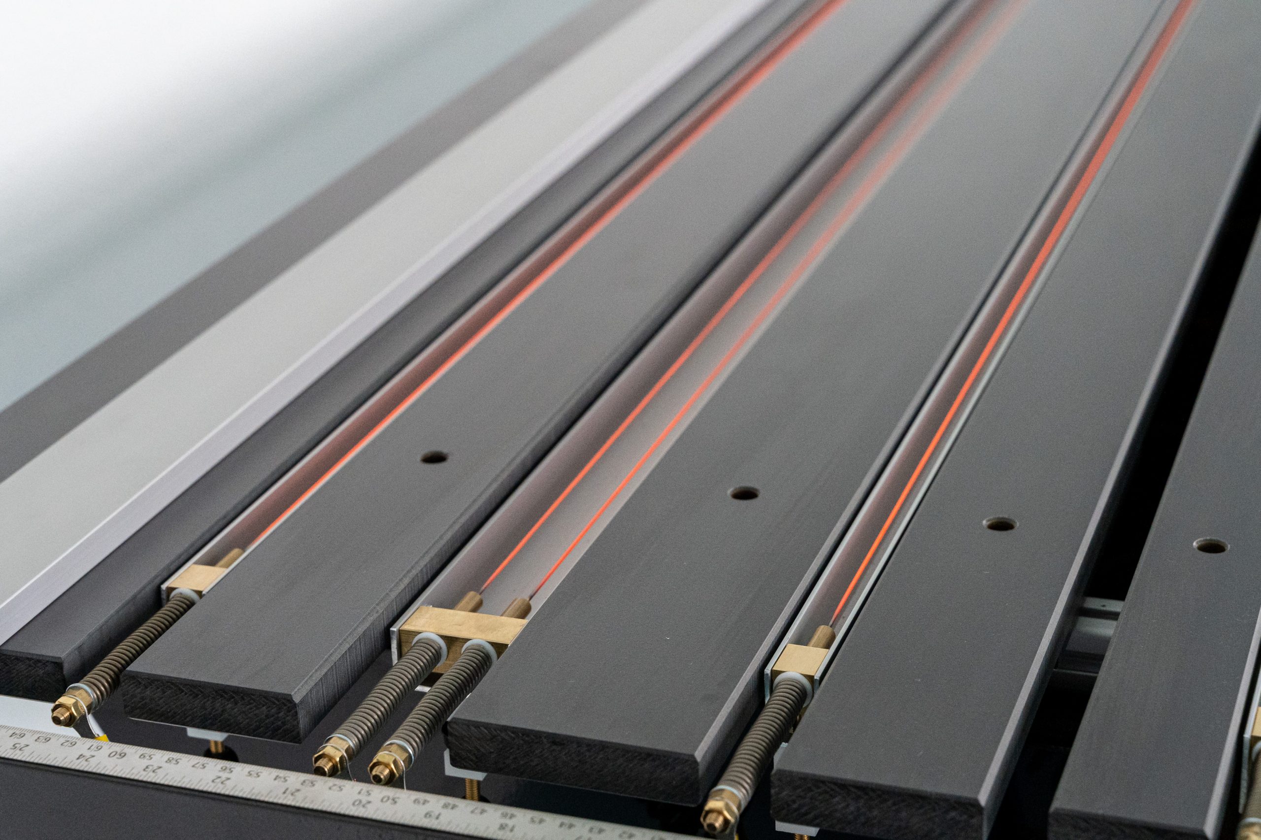Els fils calefactors dels perfils són regulables en alçada i regulables amb molta precisió a temperatura mitjançant unitat digital. La màquina per al doblegat de metacrilat HRT està equipada de sèrie amb un topall paral·lel amb indicació en mil·límetres i polzades.