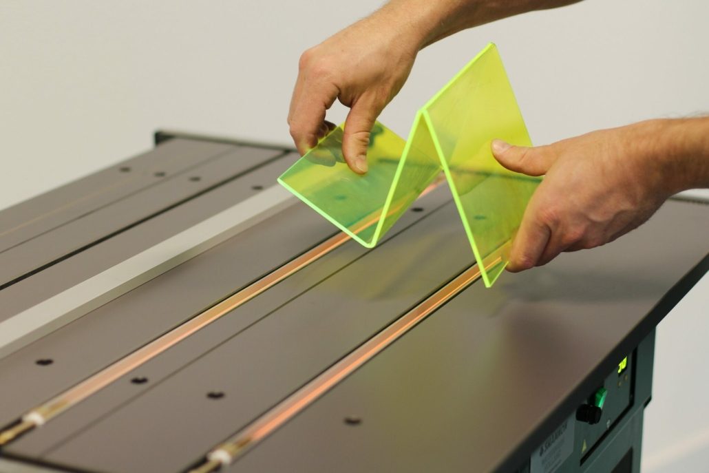 Màquines doblegadores de làmines acríliques professionals amb subescalfament, compostes per perfils fàcilment ajustables amb fils calefactors.