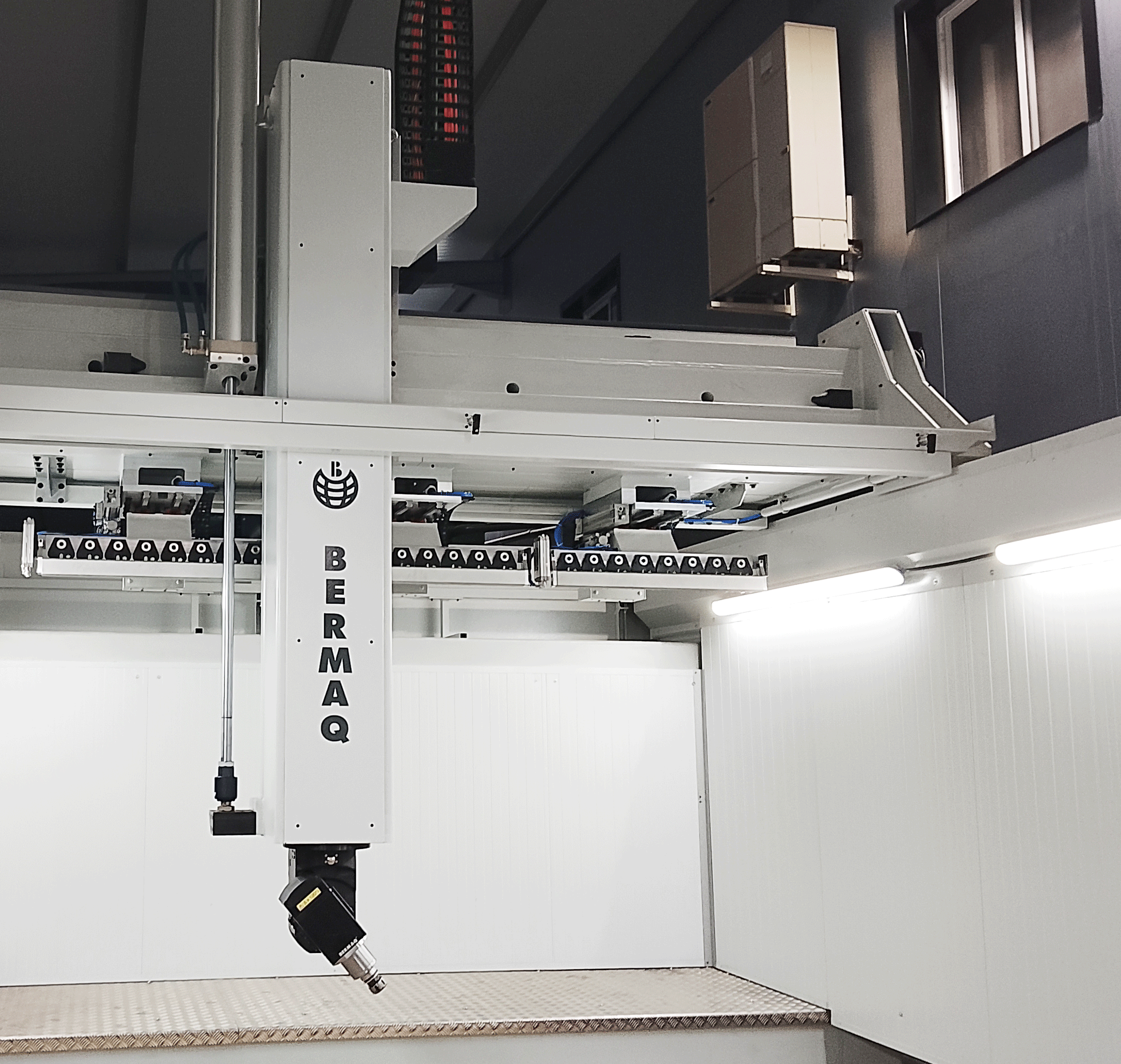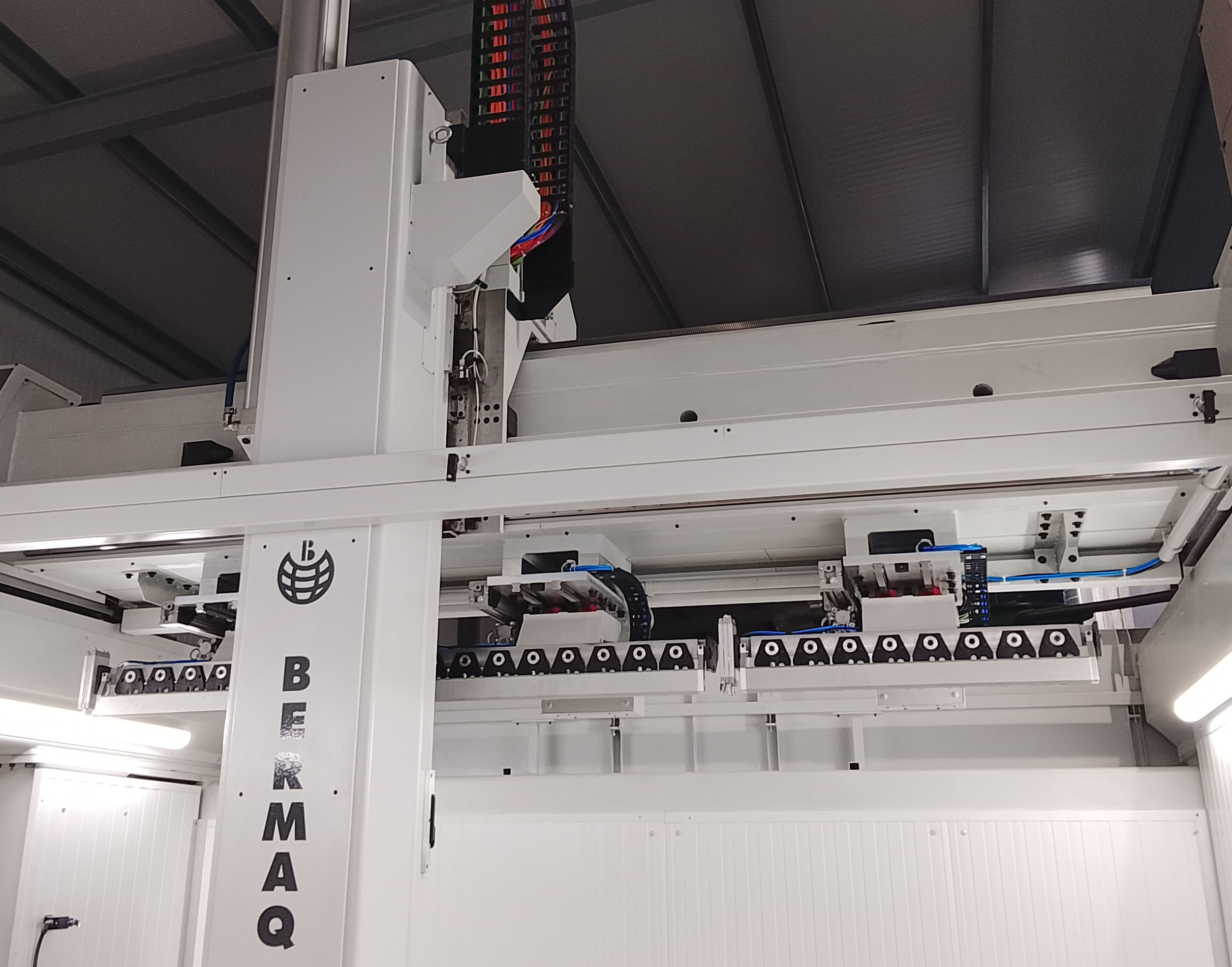 Màquina equipada amb tres magatzems lineals integrats al pont de l’eix Y, cadascun amb capacitat per a 8 posicions d’eines, proporcionant un total de 24 posicions disponibles. Aquesta configuració permet un canvi ràpid i automàtic d’eines, optimitzant els temps de producció i augmentant l’eficiència en processos de mecanitzat complexos. La ubicació estratègica dels magatzems al pont de l’eix Y facilita un accés directe i segur a les eines, garantint una operació contínua i minimitzant interrupcions durant el mecanitzat.