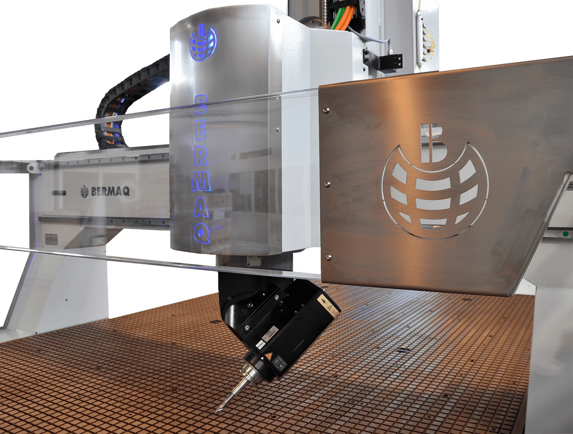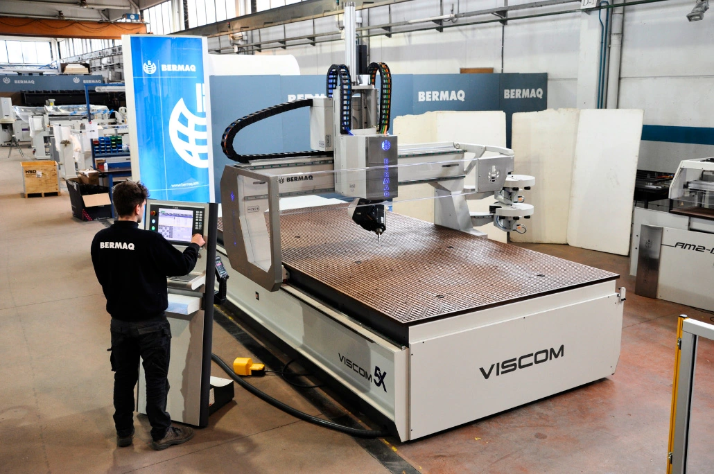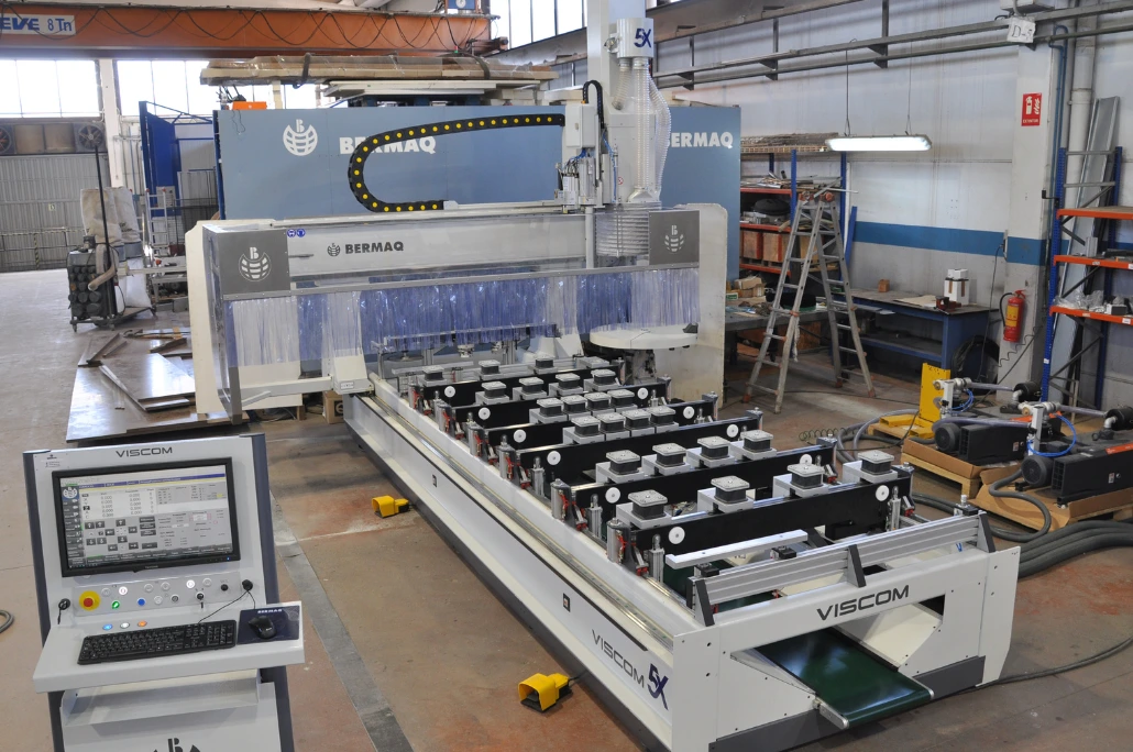 La fresadora CNC VISCOM 5X de BERMAQ compta amb un capçal de fresat de 11 kW en HSK-F63 i refrigeració líquida, un palpejador d'eina per a la calibració d'altura, una taula de buit de resina fenòlica amb 8 zones de buit automàtiques i independents (configurables des del panell de comandament i fins i tot des del programa de mecanització), i incorpora inserits metàl·lics roscats per a la fixació de peces i utillatges.