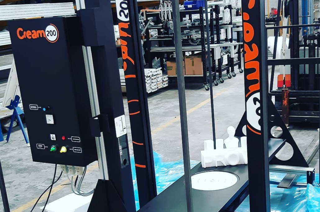La màquina de tall de poliestirè Cream 200, amb 2 eixos i un torn vertical estàndard, permet la creació ràpida, precisa i senzilla de formes intricades en 2D i 3D. Inclou el programari Nettuno, que admet tècniques de tall avançades i la creació de complexos dissenys d'escuma. Això fa que sigui una excel·lent opció per a una varietat d'aplicacions, incloent-hi objectes 3D, decorats de teatre, decoracions de festes i esdeveniments, comunicació visual, senyalització de monuments, ninots de pastís, *gadgets promocionals, decoració de centres comercials, expositors de fires, aparadors, decorats de pel·lícules, lletres, figures, i molt més.